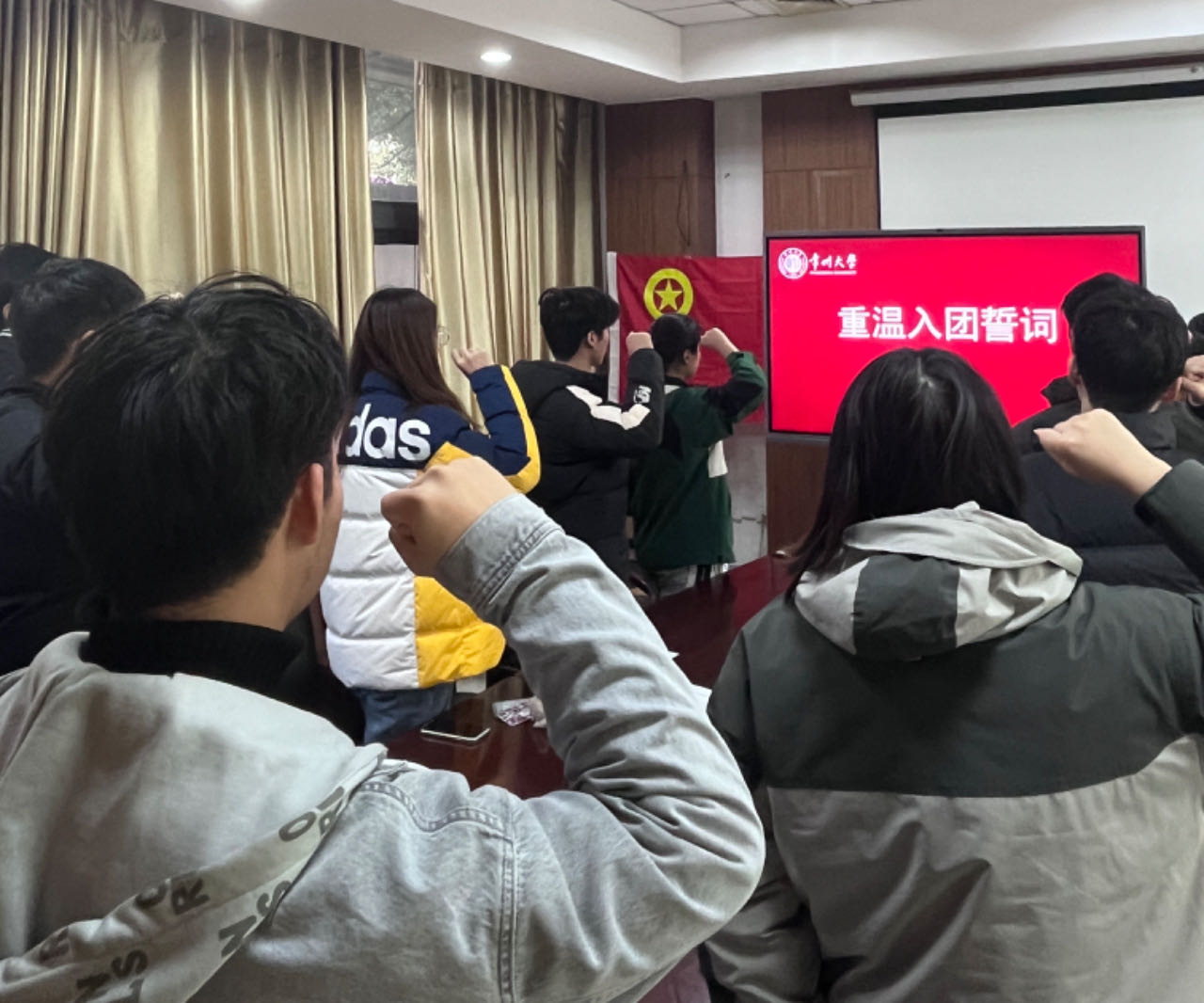 最后,房硕带领全体参会人员面向团旗,重温入团誓词。